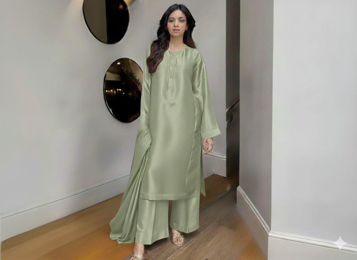 Elevate your refined collection with HU Studio's "Sabza-e-Jamal" Ensemble, expertly crafted for effortless grace and luminous style. This carefully designed suit features a luxurious silk-like fabric in a serene mint hue, tailored into a chic kurta with classic palazzo trousers, providing both subtle movement and high-end elegance for day or evening. Available as a 2-piece set (Kurta and Trousers) or as a complete 3-piece ensemble with the matching soft drape dupatta, it offers unparalleled versatility and a silky texture that enhances your sophisticated look effortlessly.