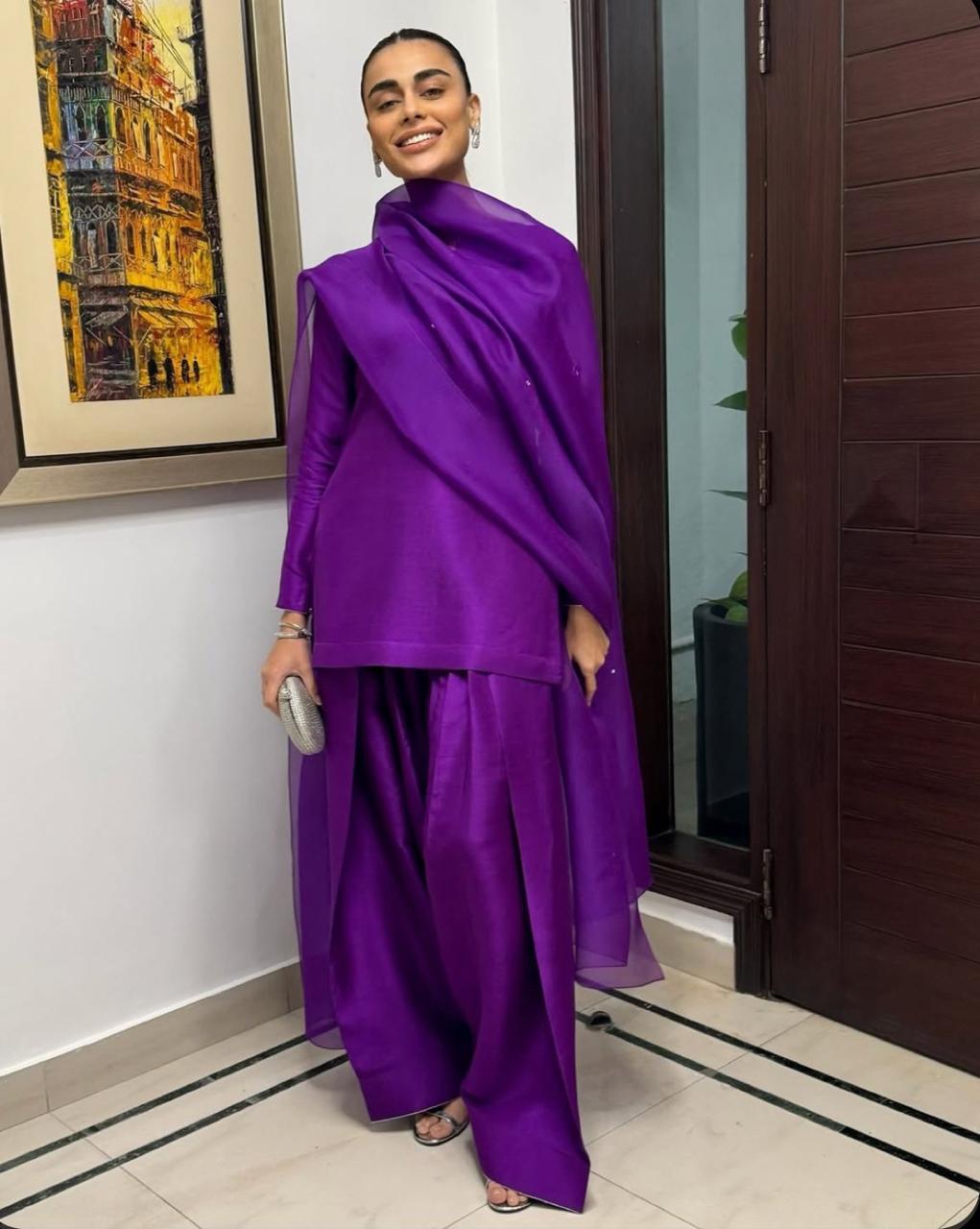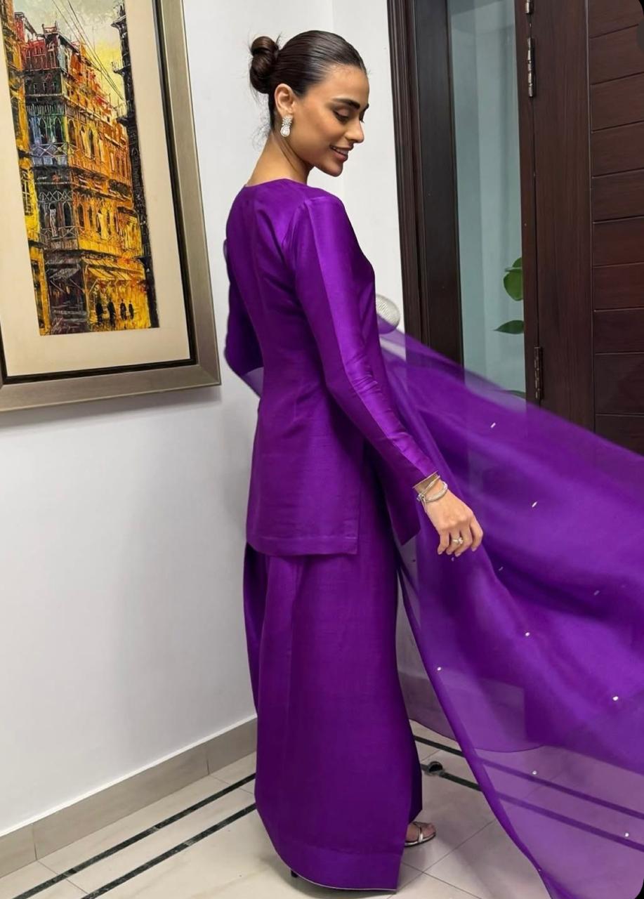Elevate your statement wardrobe with HU Studio's "Banafshi Nikhaar" Suit, expertly crafted for vibrant color and contemporary flair. This meticulously designed ensemble features a luxurious silk-like fabric in a bold purple hue, perfectly tailored with a classic short kurta and stylish Patiala-style shalwar for a voluminous, eye-catching look. Available as a 2-piece suit (Kurta and Shalwar) or as a complete 3-piece ensemble with the ethereal sheer dupatta, it offers unmatched versatility and a rich texture that enhances your festive occasions effortlessly.