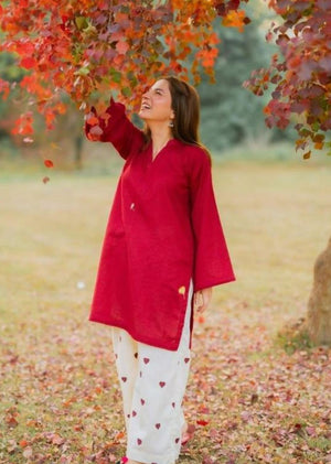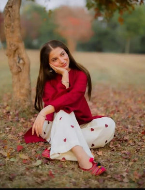 Shalwar: Contrasting off-white shalwar adorned with delicate, all-over heart embroidery for a playful and charming finish.