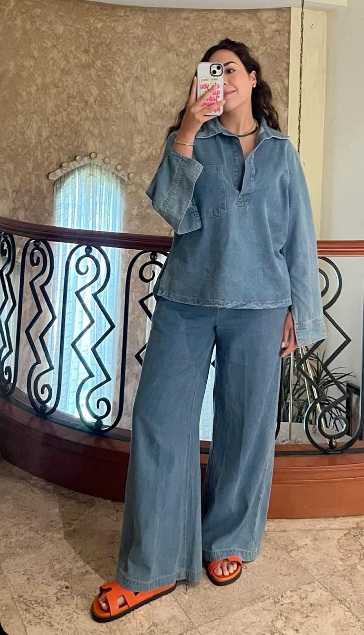 Elevate your contemporary wardrobe with HU Studio's "Azure Drift" Co-ord Set, expertly crafted for effortless style and all-day comfort. This carefully designed ensemble combines soft, mid-wash denim fabric with a relaxed-fit pullover top and chic wide-leg trousers, providing both ease and modern sophistication. Perfect for versatile styling whether paired with heels or trainers it offers a timeless aesthetic and a breathable texture that enhances your sophisticated casual outfits effortlessly.