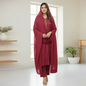 The ensemble is defined by its crowning feature: a generously sized matching shawl (dupatta). The shawl is heavier than a typical dupatta, suggesting the warmth and regal formality of a Kashmiri or Pashmina-style wrap. Draped beautifully over the shoulders, it frames the face and completes the look with a sense of grace, modesty, and depth of color.