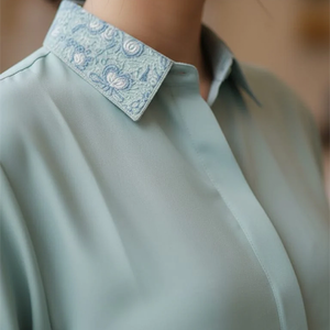 | Embellishment | Lace/Embroidery: Detailed lace or intricate embroidery is prominently featured on the patch pockets located near the hip and along the edge of the collar, adding a delicate, sophisticated touch. |