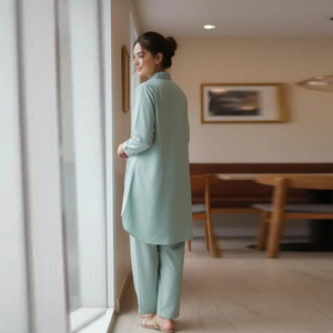 | Bottom Style | Trousers/Pants: Matching mint green trousers with a straight-leg or relaxed fit, maintaining the overall modest and comfortable silhouette. |