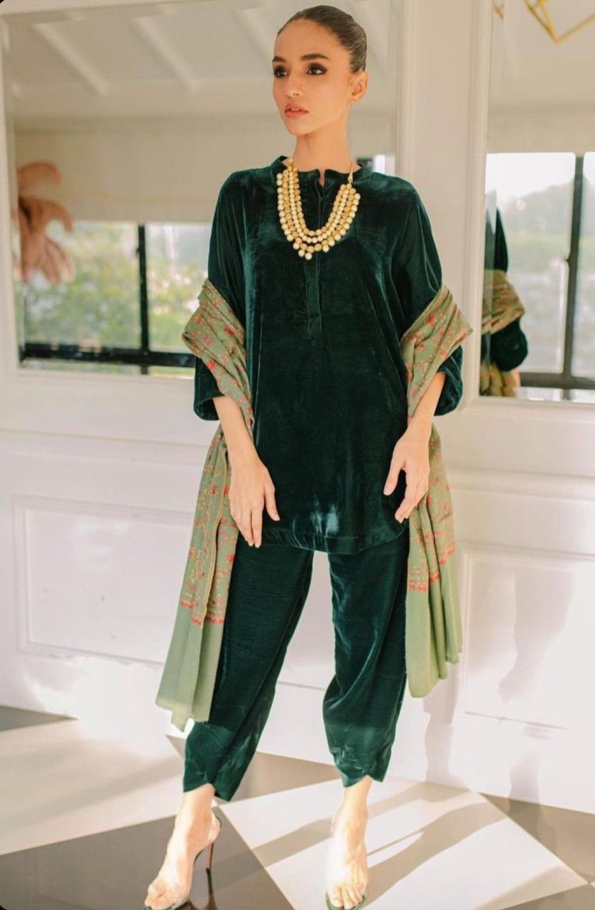 Elevate your winter wardrobe with HU Studio's "Forest Reverie" Ensemble, expertly crafted for opulent warmth and captivating style. This thoughtfully designed set features sumptuous, deep forest green velvet fabric in a chic tunic-and-trouser silhouette, providing both unparalleled comfort and exquisite sophistication for the colder months. Perfectly paired with a beautifully printed, contrasting shawl for an added layer of grace, it offers essential versatility and a plush, luminous texture that ensures a striking and luxurious presentation effortlessly.
