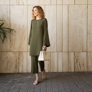 Experience the perfect harmony of structure and movement with the Karandi Flow Set. Expertly crafted from premium Karandi fabric, this two-piece ensemble offers a graceful, flowing silhouette ideal for sophisticated daytime or evening wear. The rich, monochromatic shades (Olive and Deep Cocoa) provide a modern, minimalist canvas, ensuring you feel as comfortable as you look chic. It’s the ultimate combination of traditional texture and contemporary design.