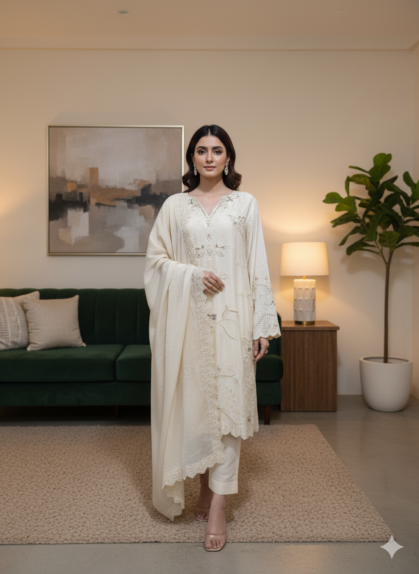 The Luminous Cream & Needlework Masterpiece is the epitome of sophisticated daytime glamour and timeless artistry. This ensemble is rendered in a soft, flattering Off-White or Cream shade, a hue that projects purity and high elegance.