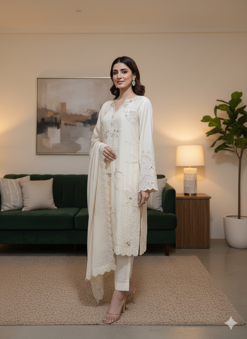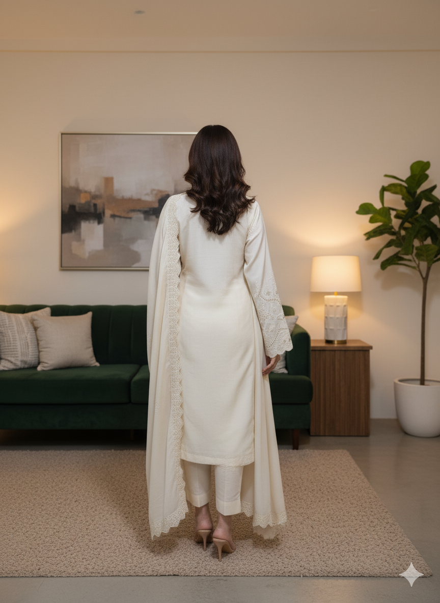 The true beauty lies in the detailed surface work. The fabric, likely a fine cotton net or georgette, is adorned with tonal Chikankari-style embroidery—an intricate white-on-white needlework technique. This subtle, shadow-like detailing gives the suit immense texture and depth without relying on heavy bling. Further enhancing its delicate aesthetic are lace inserts and finished trims, which add a feminine, bespoke touch to the neckline, cuffs, and hem.