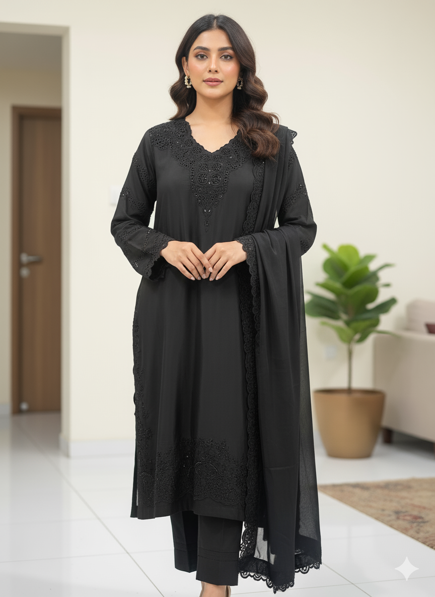 The defining feature of this look is the intricate filigree or cutout detailing—a sophisticated form of embroidery or appliqué that often mimics lace or geometric patterns. This technique creates a delicate, see-through 'shadow work' effect, offering visual texture and a lighter feel against the darkness of the fabric. The kameez (tunic) likely features a clean, tailored cut that enhances the precision of the detailing.