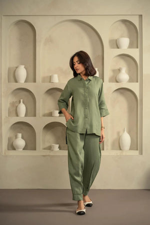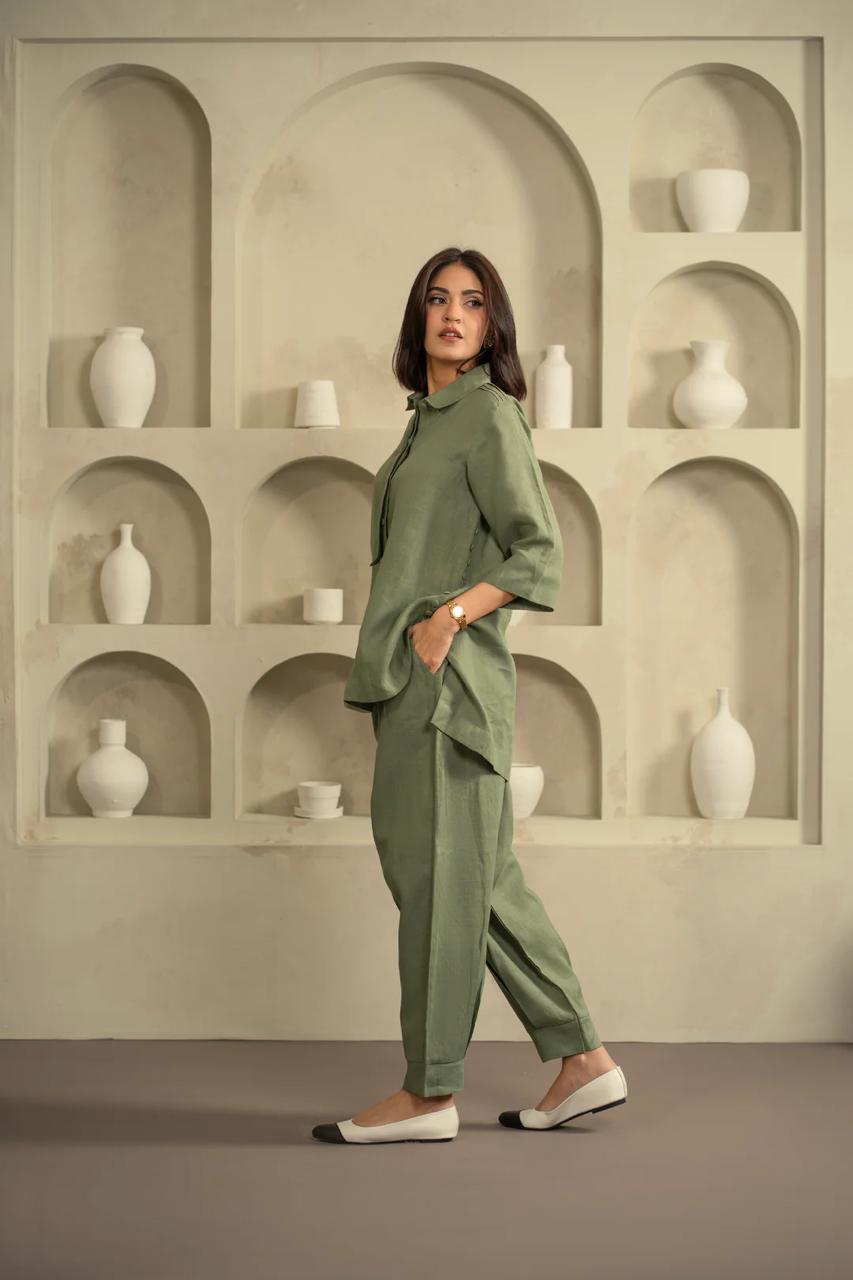 Shirt: A sophisticated sage green cotton shirt featuring a hidden button placket, classic collar, and structured three-quarter sleeves with unique shoulder tab detailing.