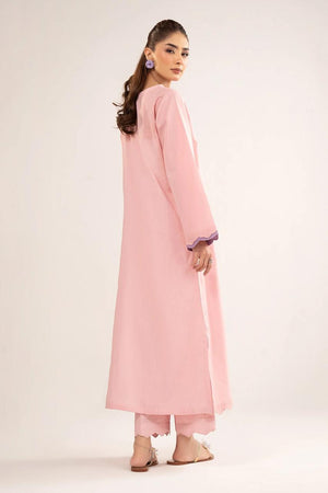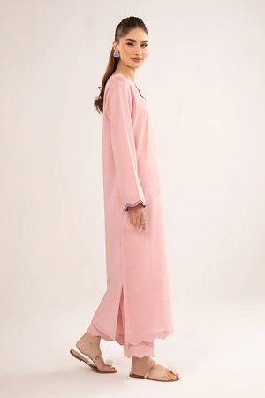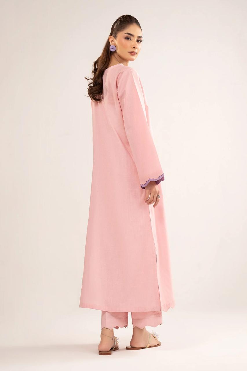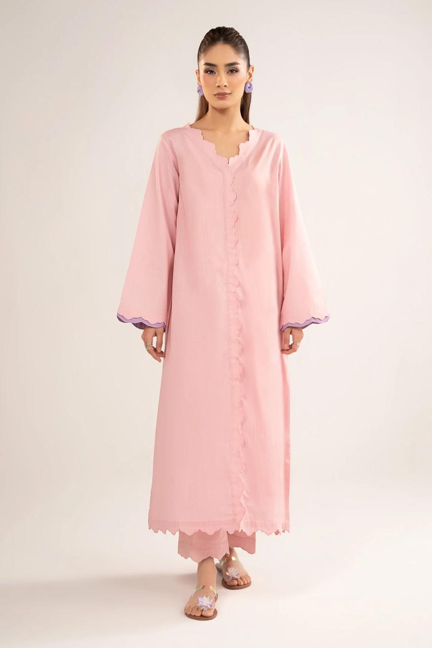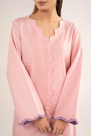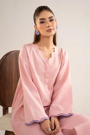 Shirt: A charming powder pink long tunic featuring a unique scalloped V-neckline, matching scalloped hem, and wide sleeves with contrasting lilac accents.