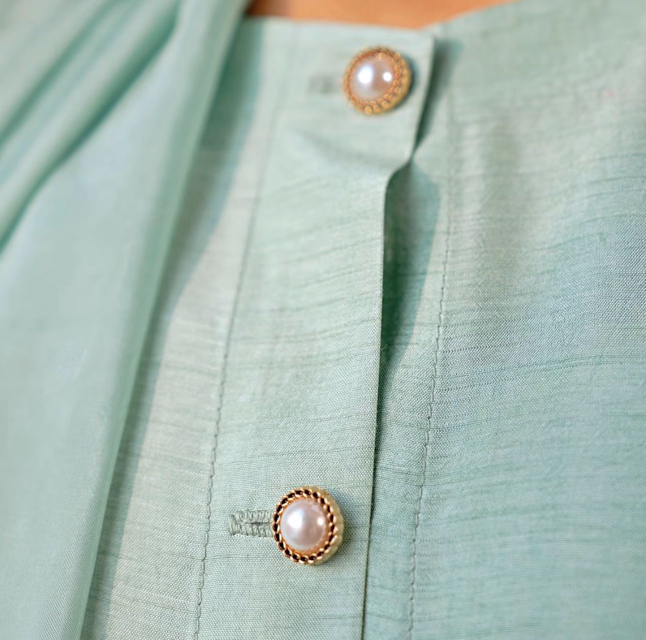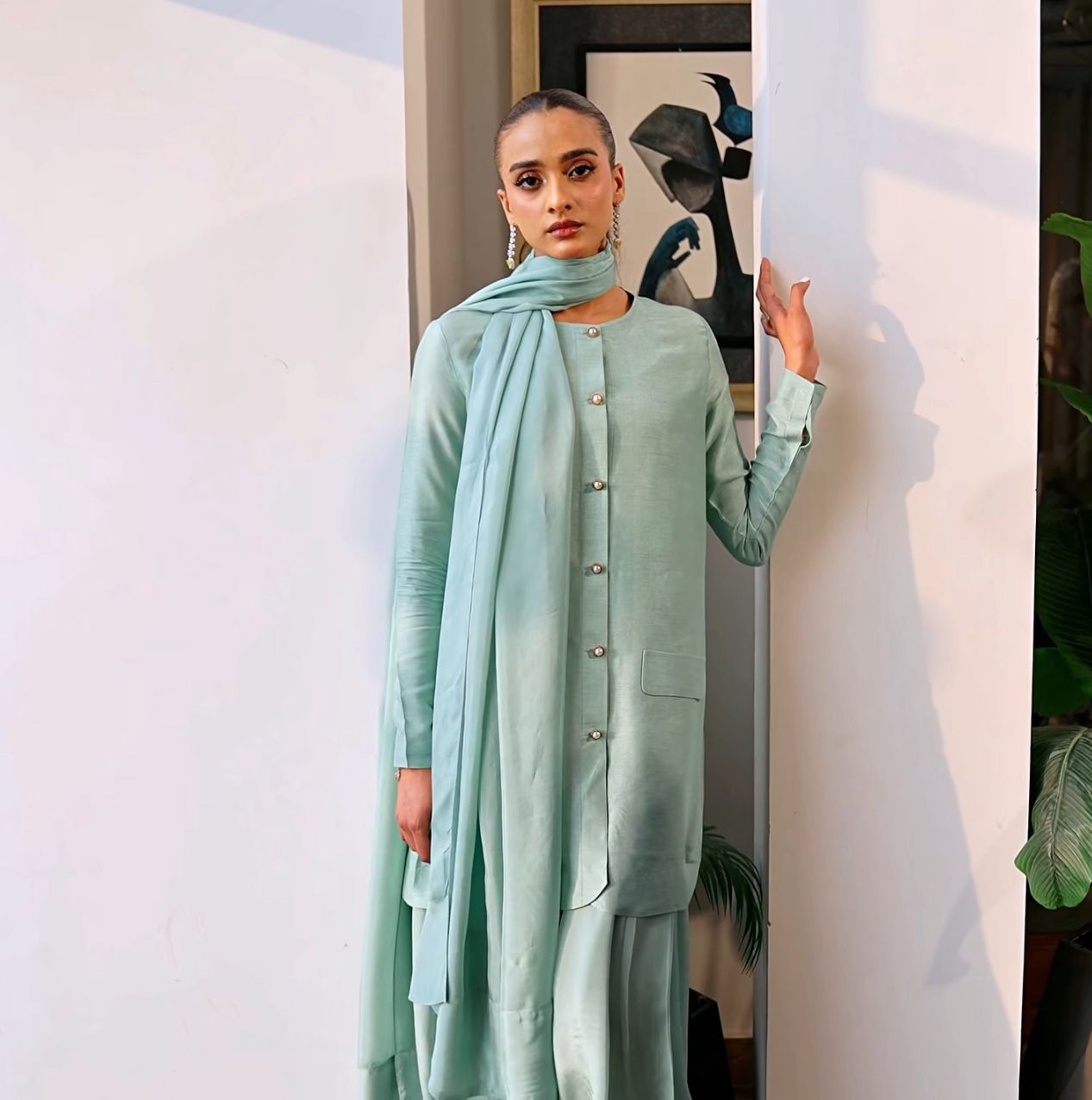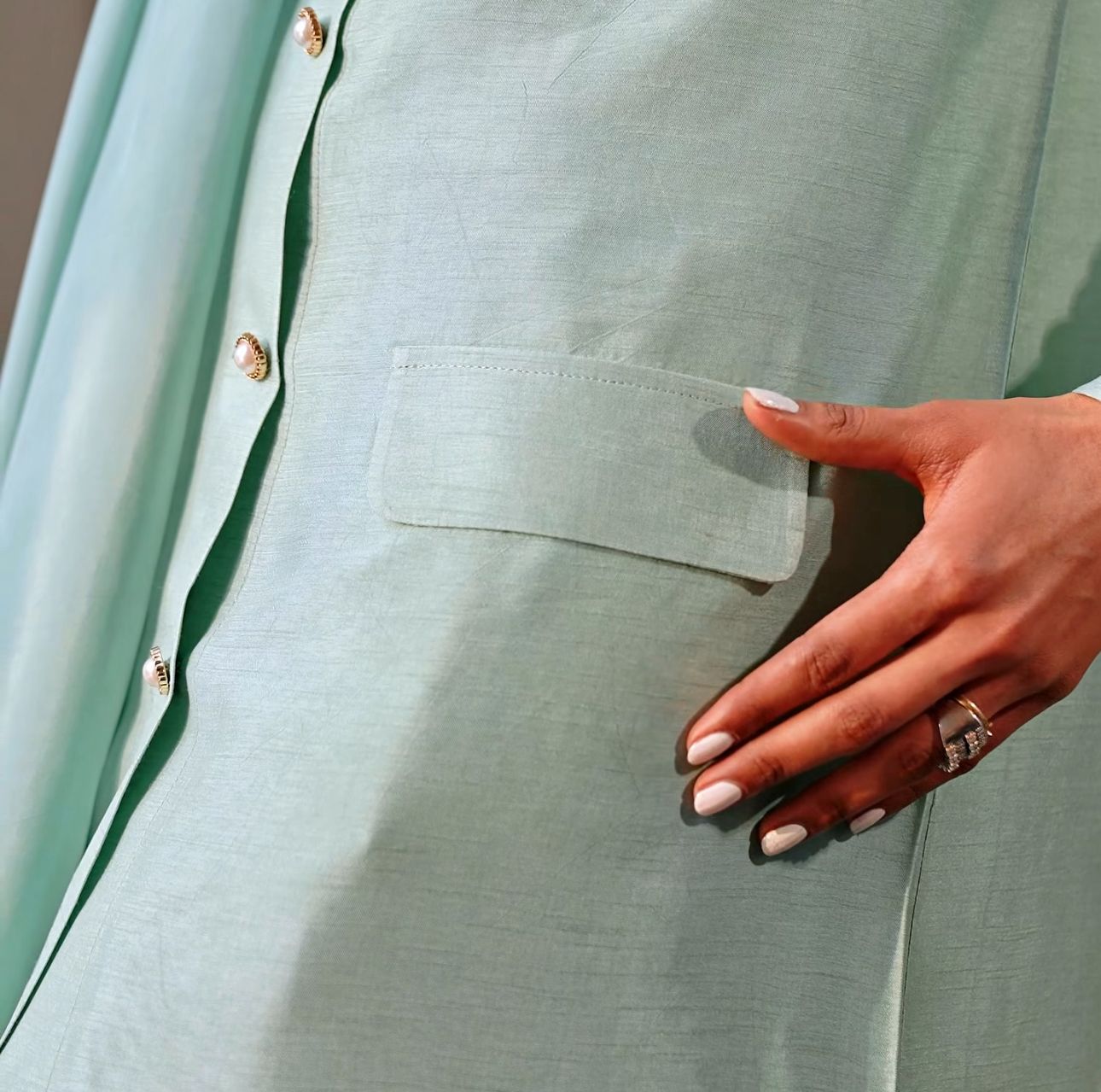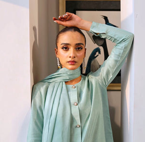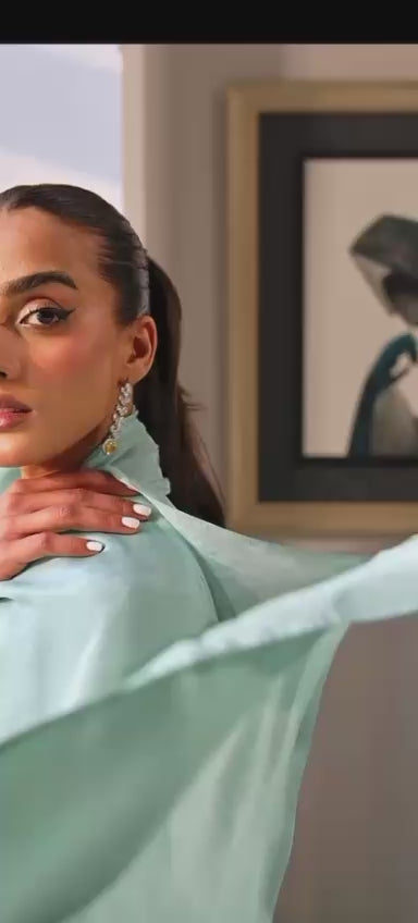 Exuding a refreshing aura, this mint green ensemble is a tribute to minimalist luxury. Crafted from premium silk with a subtle textured finish, it offers a serene yet high-fashion look perfect for festive gatherings.