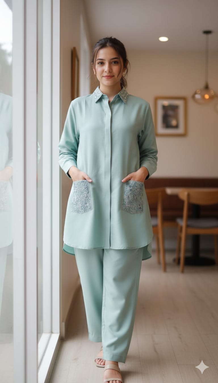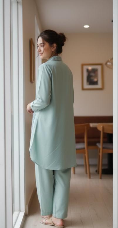 | Bottom Style | Trousers/Pants: Matching mint green trousers with a straight-leg or relaxed fit, maintaining the overall modest and comfortable silhouette. |