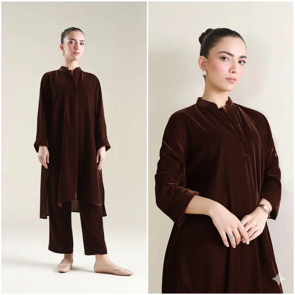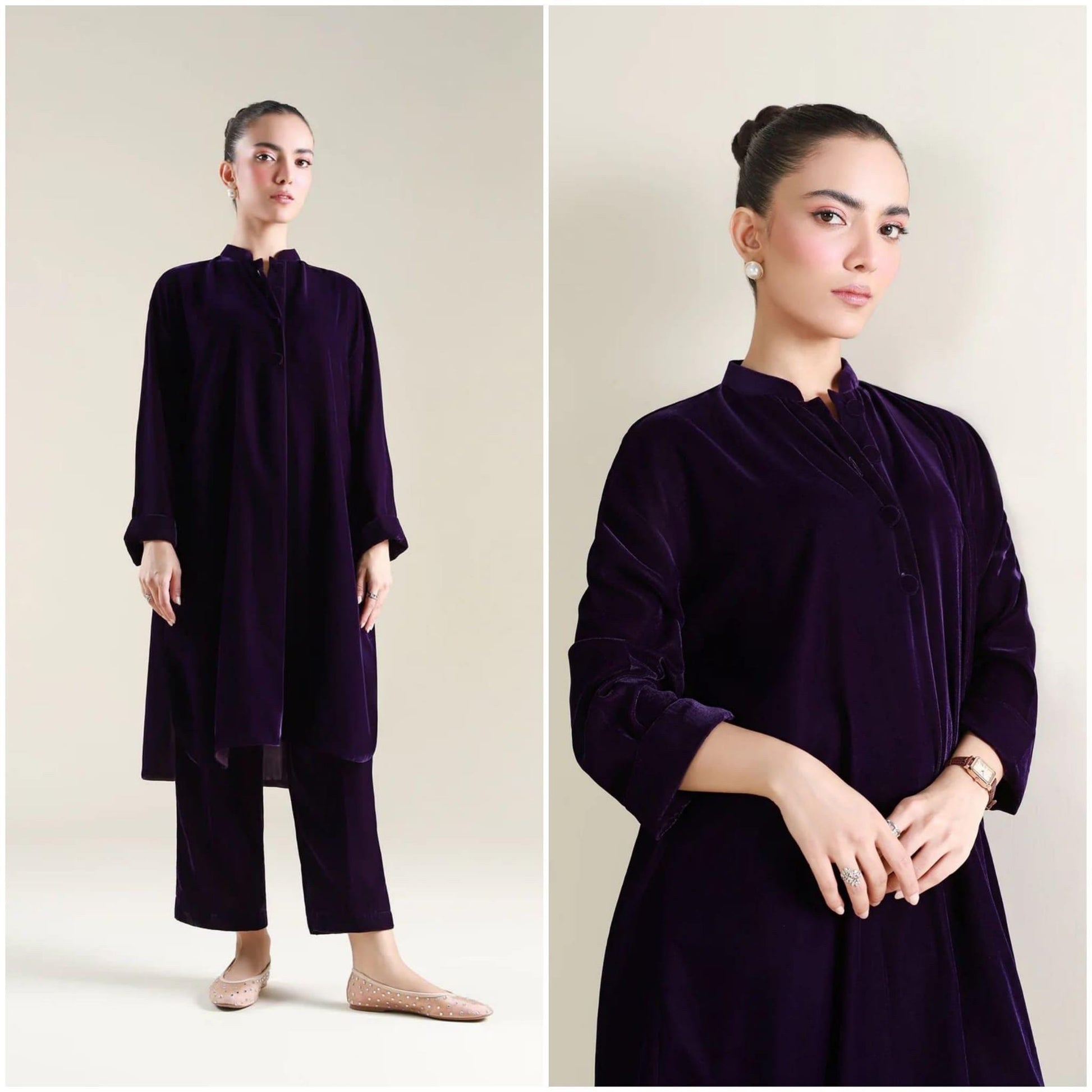 Crafted from sumptuously soft, deep plum (or aubergine) velvet, this two-piece set is the epitome of winter elegance. The straight-cut tunic/kurta features a refined band collar and a clean, minimalist silhouette that flows beautifully, offering both comfort and sophistication.