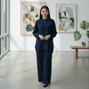 Overall Aesthetic: The outfit combines a traditional South Asian suit structure with minimalist, modern design elements like the sleek collar and wide-leg pants. It presents as a refined and polished ensemble, perfect for professional, formal, or smart-casual occasions.